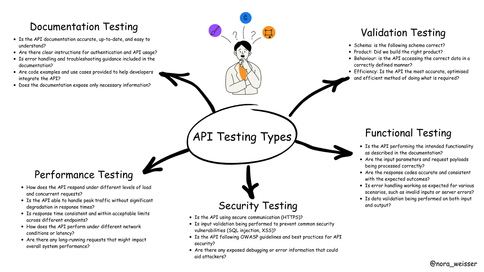 This schema illustrates the types of questions that a tester can pose to ensure comprehensive API testing. This list is not limited.