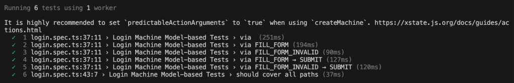 Creating the tests is super easy since we let xstate generate our test plans for us. The snippet below basically generates the tests dynamically based on the model.
